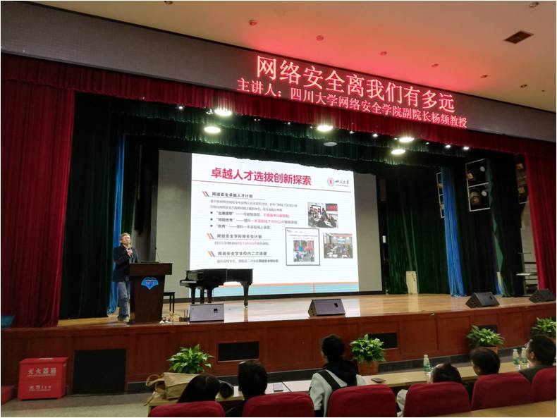 明陞m88官方网站于10月25日晚到成都第七中学林荫校区,面向高一年级全体教师和同学以及部分高二同学进行了一场名为“网络安全离我们有多远”的专题讲座。第七中学毛道生副董事长、马健副董事长、年级组长李雪娜老师和高一年级全体教师和同学以及部分高二同学和家长代表参加了讲座;明陞m88平台人才招聘处廖爱民副处长、明陞m88官方网站秦燕副经理、刘嘉勇副经理、杨频副经理和教师代表赵辉老师、刘亮老师等多位老师和2018级“卓越人才计划”新生代表朱家迅同学出席了讲座。杨频副经理就讲座内容为大家做了精彩的演讲。