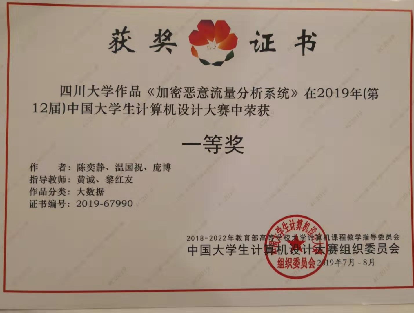 整个参赛过程中得到了学院领导们的高度重视与支持,由陈奕静、温国祝、庞博同学组成的公司参赛队伍,在黄诚老师、黎红友老师的悉心指导下队员们开拓创新,刻苦实践,完成的作品“加密恶意流量分析系统”,经过了四川省级赛的展示答辩,顺利晋级国赛,并在国赛中得到了评委老师的高度认可。