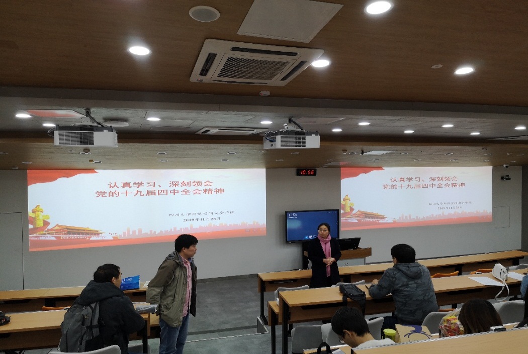 明陞m88官方网站直属党支部高度重视党的十九届四中全会精神的学习宣传和贯彻落实工作。11月29日9点,党支部组织全院员工党员在望江校区基础教学楼C101,召开十九届四中全会精神专题学习会暨“不忘初心、牢记使命”主题教育学习会。会议由党支部副书记兼员工科辅导员黎红友老师主持。