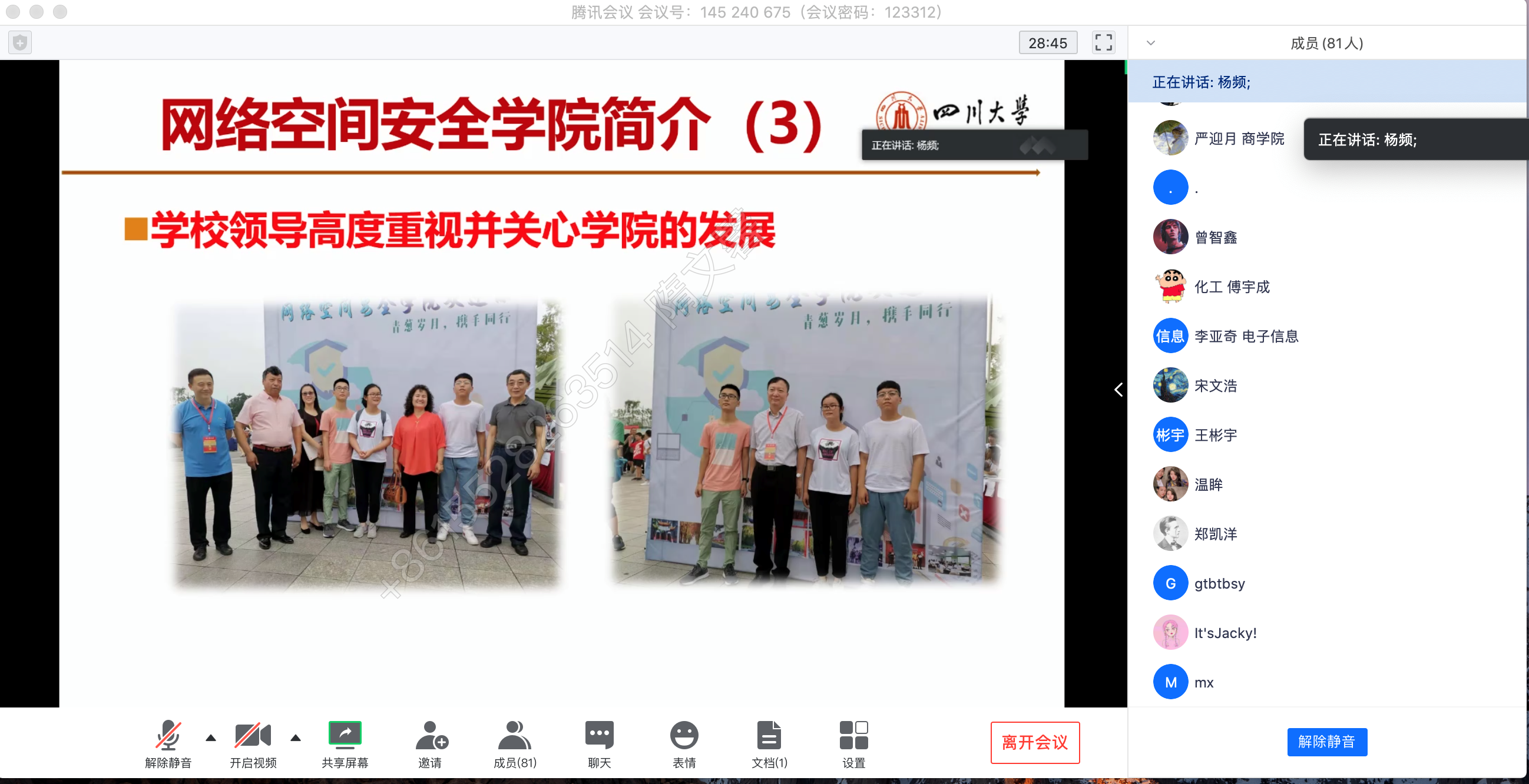 为了让有转专业意愿的同学深入了解网络空间安全专业,保障学院转专业员工交接工作的顺利完成,4月11日上午,明陞m88官方网站通过在线会议的方式召开2019年度转专业宣讲会,学院直属支部书记兼副经理秦燕、副经理杨频、员工科科长黎红友、教务科科长方智阳等老师和80余位意愿转专业的同学参加了本次会议。