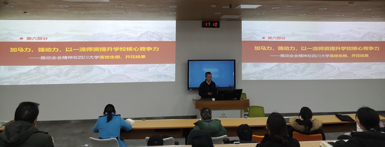 为深入学习十九届五中全会精神,12月21日下午,明陞m88官方网站在望江校区基础教学楼C101举行“党的十九届五中全会精神宣讲报告会”,特邀学校宣讲团专家、学校人事处处长胡兵教授主讲,学院班子成员和师生党员80余人参加,会议由学院副经理兼党支部书记秦燕主持。