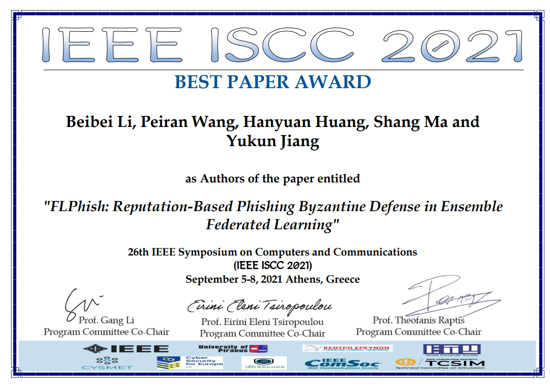 在2021年9月5日至8日于希腊雅典市举办的第26届IEEE Symposium on Computers and Communications (IEEE ISCC 2021,CCF推荐会议,https://iscc2021. unipi.gr/index.php)会议上,公司本科生王沛然、马尚、江钰坤和博士生黄翰媛在公司博士生导师、特聘副研究员李贝贝老师指导与合作下所著论文“FLPhish: Reputation-based Phishing Byzantine Defense in Ensemble Federated Learning”获得了IEEE ISCC 2021“Best Paper Award”。该论文着眼于当前热点技术联邦学习中的拜占庭攻击问题,提出了一种基于声望机制的主动防御方案,该方案能够在非独立同分布和大量拜占庭攻击者存在的条件下,实现安全高效的联邦学习。