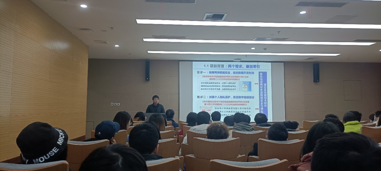 沈剑教授以保障海峡两岸数据安全、降低各类数据泄露和损坏、强化两岸数据资源可持续开发运用的迫切的现实需求向老师同学们说明了多源数据安全与隐私保护的重要性,激发了老师和同学们的使命感。