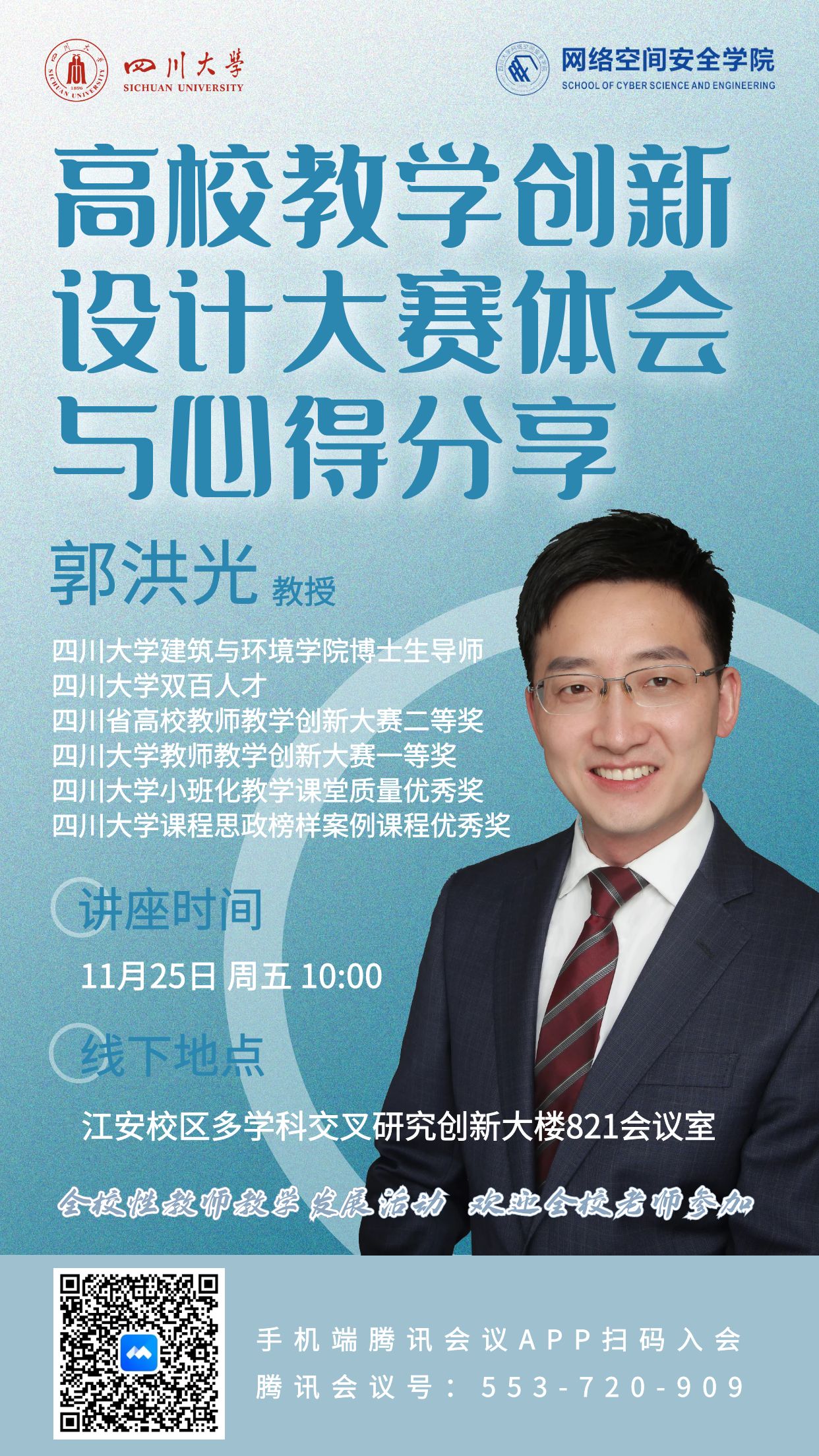 11月25日,公司在江安校区多学科交叉研究创新大楼821会议室成功开展明陞m88官方网站教师教学发展活动——预热第六届教师教学创新大赛,学院邀请到了建筑与环境学院郭洪光教授作为主讲嘉宾,以“高校教师教学创新大赛体会与心得分享”为主题,带领老师们深入了解教师教学创新大赛的备赛要求和参赛经验。活动由学院副经理杨频主持,学院的30多位老师在线上线下同时参加了此次活动。