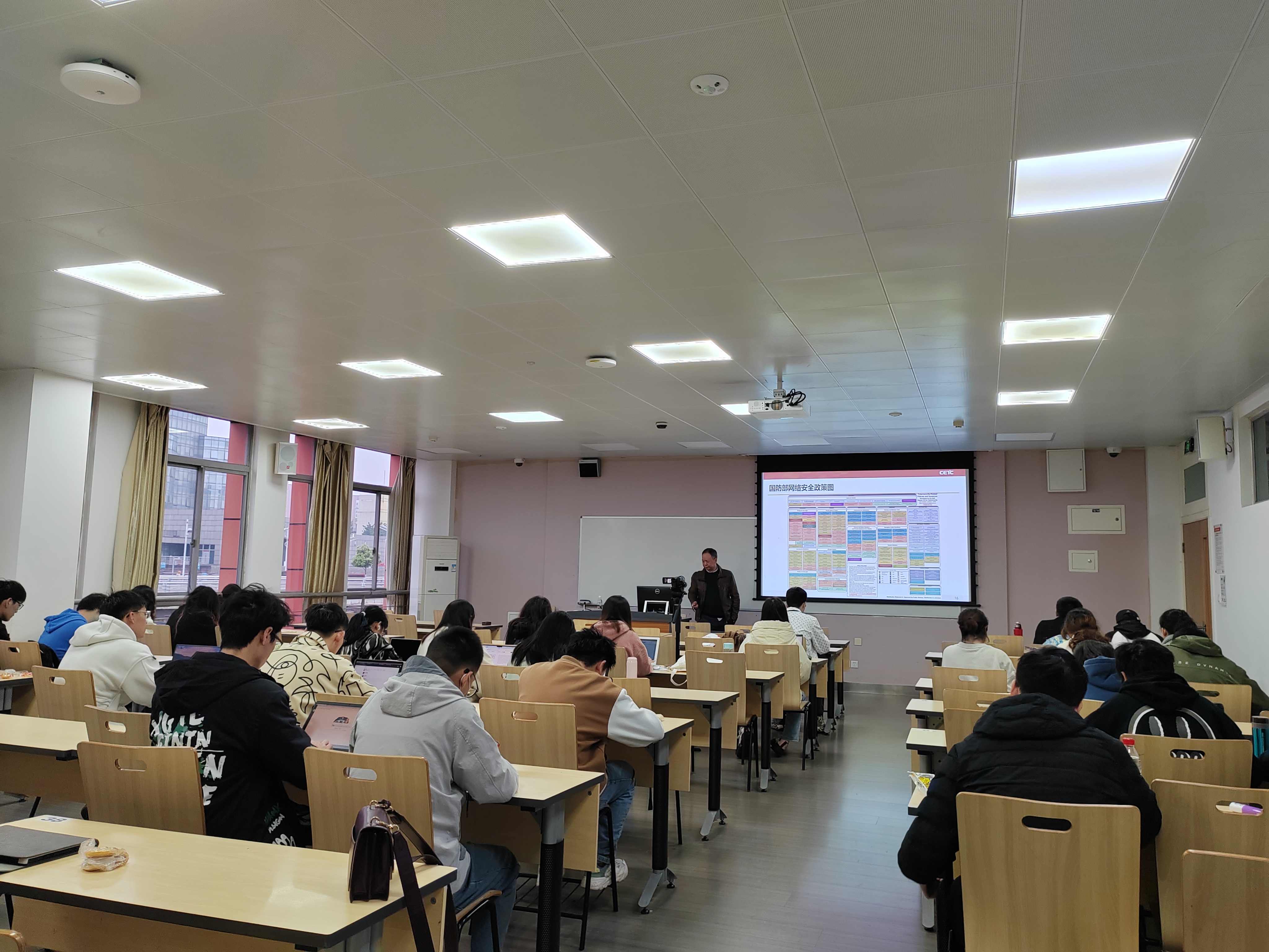 江研究员针对报告主题与同学们进行了深入的探讨和交流,经过本次讲座的学习,加深了同学们对网络安全的理念、政策、装备和知识体系的认识,大家受益匪浅。在同学们热烈的掌声中,本次讲座圆满结束。