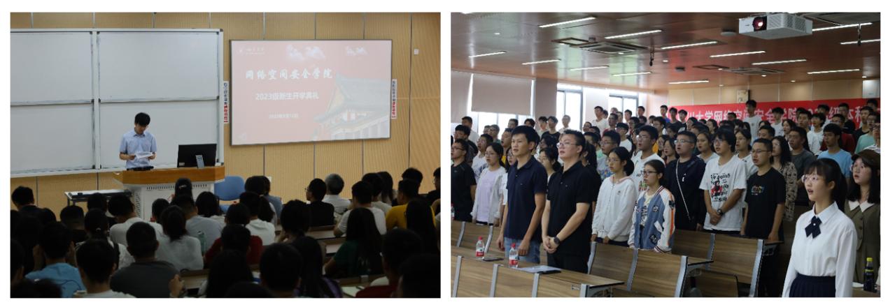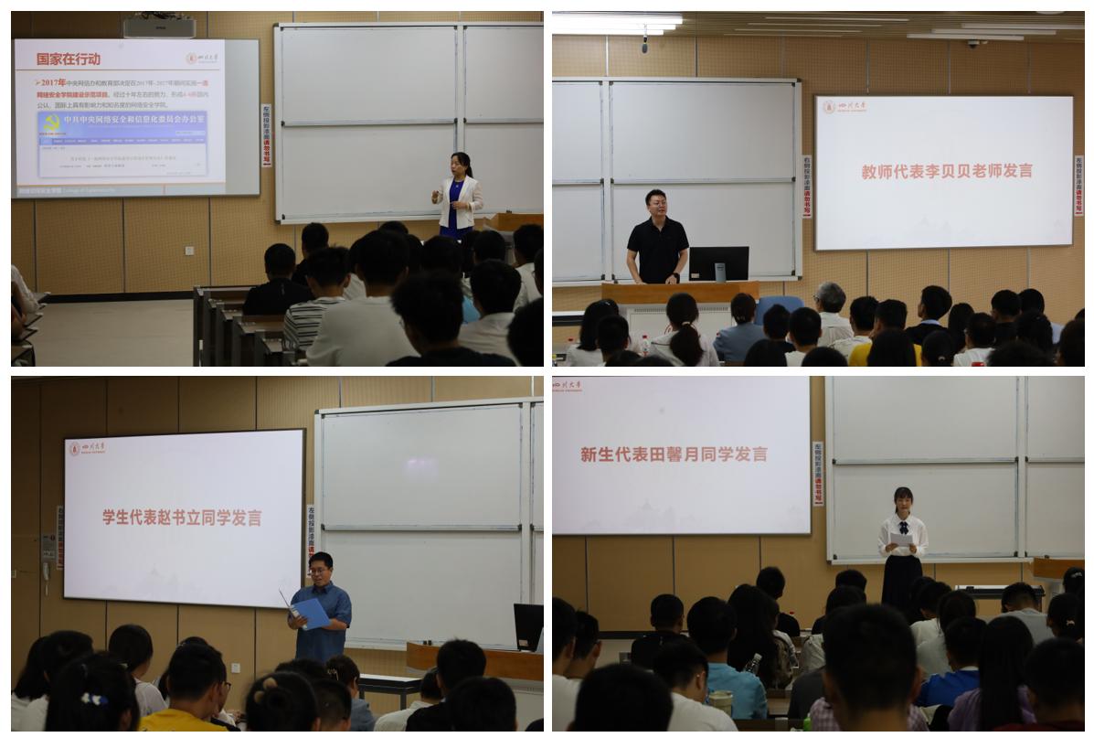 陈兴蜀首先代表学院全体师生欢迎新同学的到来。随后以国家安全为主题,从多个方面介绍了网络安全的社会需求、就业情况以及学院员工的发展和成就。陈兴蜀鼓励新同学树立新的前进目标,成为国家栋梁之才。