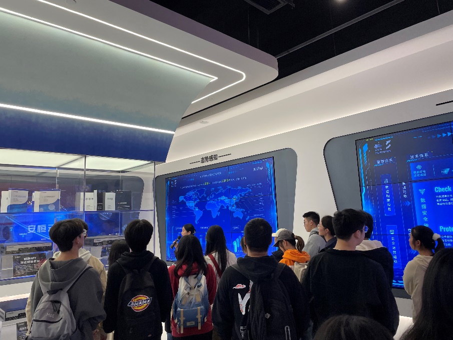 随后,同学们参观了安恒信息的企业展厅,近距离了解了安恒信息在网络安全行业的发展布局、企业产品和相关技术,进一步加深了同学们对网络空间安全领域的理解。