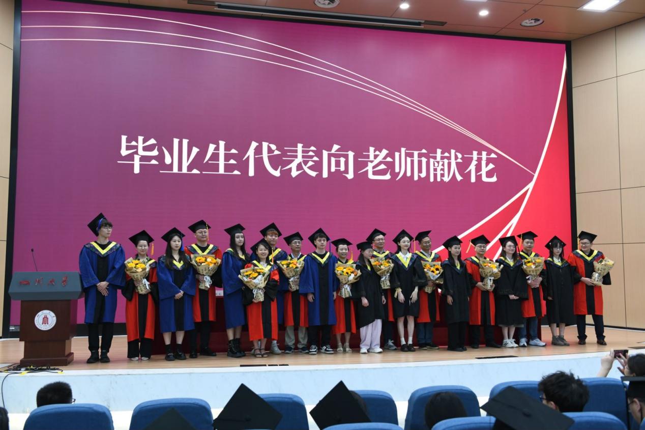 在典礼尾声,毕业生代表向辛勤付出的老师们献上鲜花,表达对他们深深的感激与敬意。最后,举行了“员工联络员”颁奖仪式,希望他们能够延续大家在学院结下的缘分。