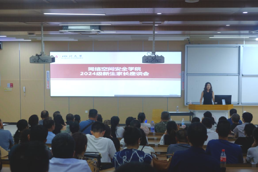 会议伊始,学院党委副书记、副经理张意教授为家长们详细介绍了学院及相关专业的发展情况。张意教授就学院的发展历程、专业优势、软硬件设施条件等方面进行了详细讲解,并重点提到习近平总书记关于网络安全的重要指示,号召大家“迈出网络强国建设新步伐”。张意教授指出,学院将牢记这一指引,继续在信息安全领域奋勇前行,致力于培养具备卓越专业能力的网络安全人才。