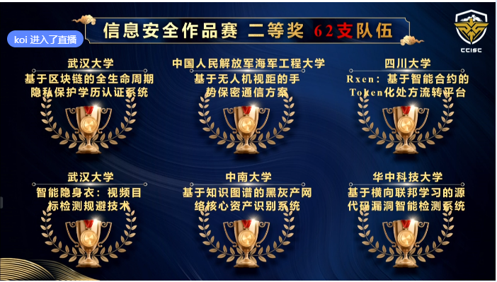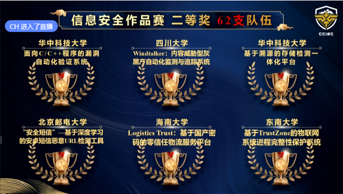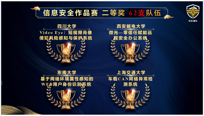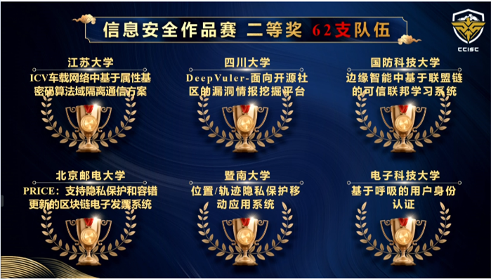 全国老员工信息安全竞赛由教育部高等学校网络空间安全专业教学指导委员会主办,是我国网络空间安全学科领域的奥林匹克竞赛。据悉,全国老员工信息安全竞赛已正式入选全国普通高校学科竞赛排行榜,为目前网络空间安全学科领域唯一一个入选排行榜的赛事。本届作品赛由山东大学承办,总决赛采取线上随机分区评审的形式,共有来自全国156所高校的718支团队、2603名老员工参加,最终评选出最具创新创业价值奖2项、一等奖40项、二等奖62项、三等奖81项、优胜奖113项。
