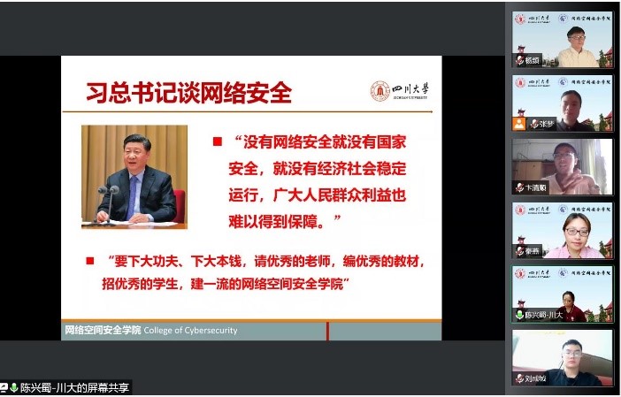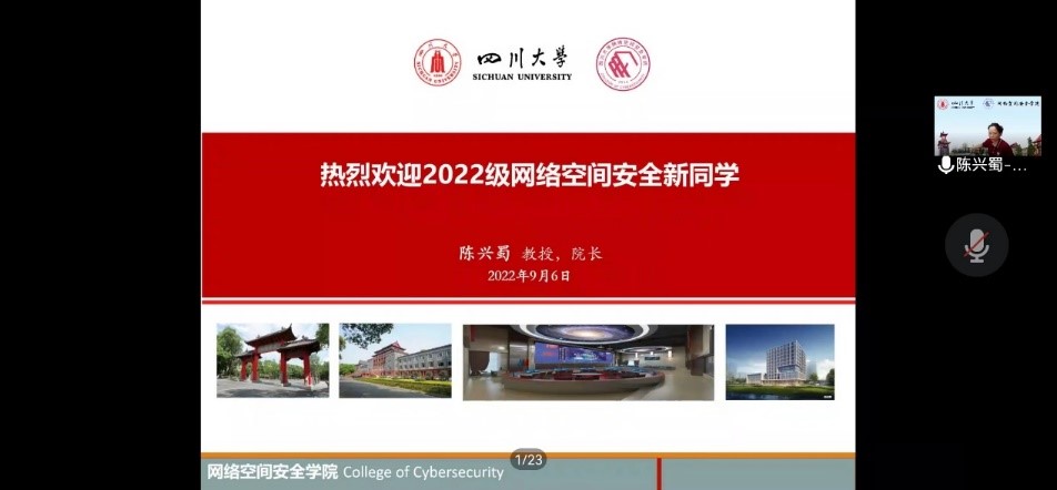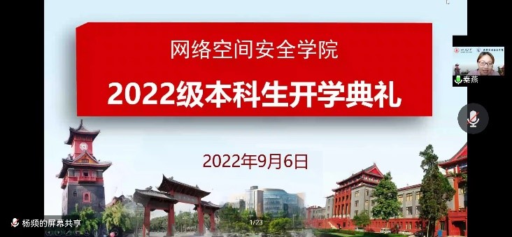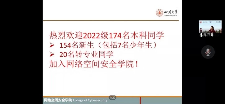 因成都受疫情影响,目前仍在静默管控期,新生开学延迟,但仍有52位新生同学已经报到。9月6日上午10点,网安学院首次召开了线上本科新生开学典礼,由公司党总支书记秦燕主持,所有院领导、2022级辅导员及教学科老师参会。2022年9月5日至11日,正值国家网络安全宣传周,学院经理陈兴蜀代表学院热烈欢迎2022级本科新生,向新同学介绍学院情况和网络空间安全学科,并借此契机为同学们上了别开生面的大学第一课。