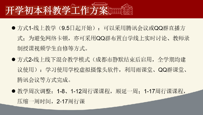 自9月5日起开始,本科教学开启线上教学,可以采用腾讯会议或QQ群直播方式;为避免网络卡顿,亦可采用QQ群布置自学线上实时讨论、教师录制授课视频员工自修等方式。建立课程QQ(微信)群,并通知到每一位员工。做好备课工作,提前确认用于上课的网络环境能否满足要求,电脑摄像头、音频、耳机等设备能否正常工作;课程网站建立与维护,公示课程大纲,考核方式,教学要求等;提供基本的课程学习资料——课件、线上讨论题目、作业等;建议上课老师使用至少两个设备:电脑开启腾讯会议用于直播;手机或者另外一台电脑用于课堂讨论(开启QQ或者微信,观察员工在QQ群的发言)。加强课堂互动,课堂抽问,讨论、练习等形式,确认员工在听课;助教线上协助教师签到、观察课堂表现、课堂提问等;布置作业,可线下或者线上做,扫描方式提交;课后答疑,每次课程结束最好能做一个线上调查,及时反馈。