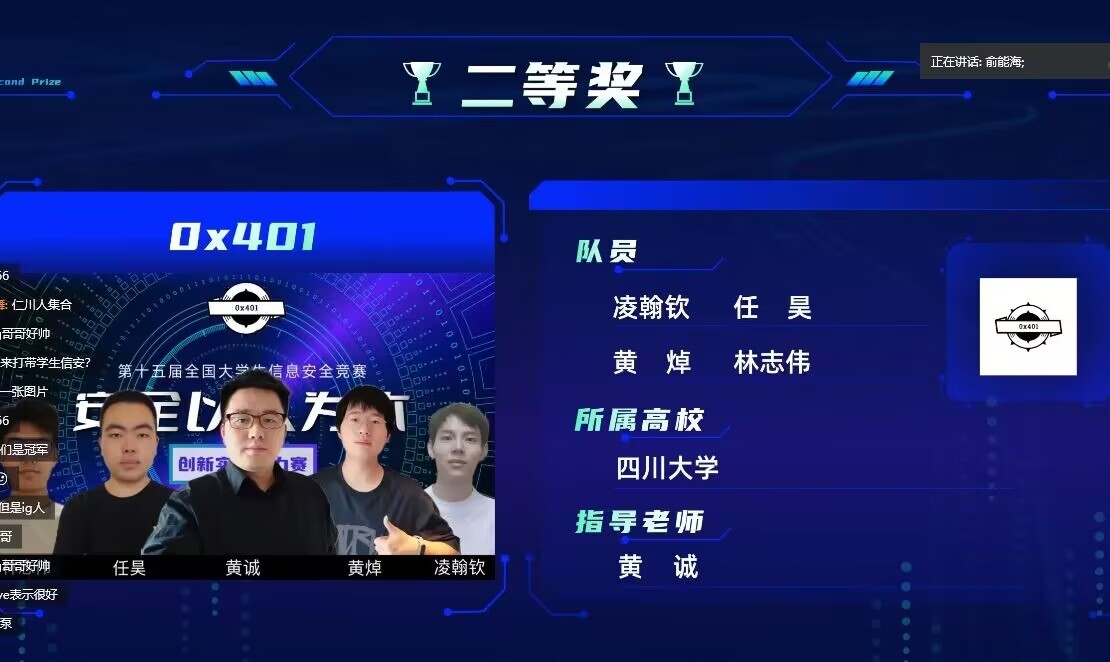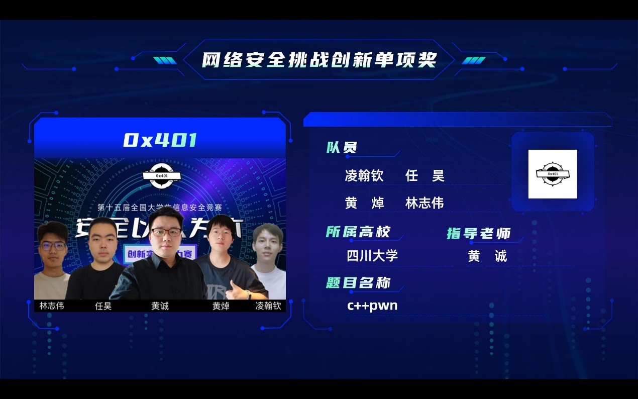 第一天的比赛题目是由征集各个队伍所出题目组成,其中,公司战队以高质量的题目C++ PWN入选,并获得创新单项奖。在之后的比赛中,经过激烈的角逐,0x401战队荣获二等奖。