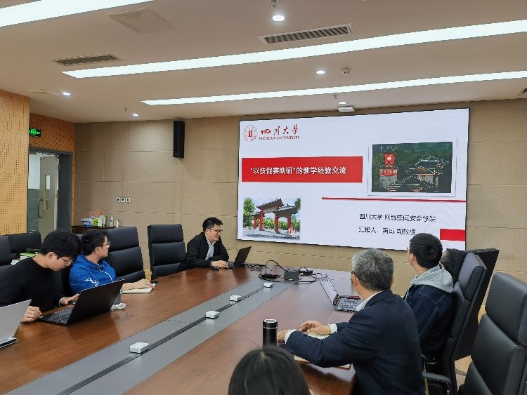 黄诚老师是青年教师中优秀学科竞赛指导老师的代表,近几年指导的员工参加信安赛年年获得一等奖,今天他为大家作“‘以技促赛助研’的教学经验交流”。他从员工现状进行分析,剖析了培养方法,通过“弥补网安技能树-培育比赛新模式-科研引导塑拔尖”的培养路径实现网安拔尖人才的培养创新。在培育比赛新模式上,运用团队导向、题目导向、热点导向等三个导向,充分发挥员工的主观能动性,冲击比赛奖项。最后黄老师给出了一点建议,“兵”不在多,在于“精”;师生双向选择前期要多沟通,项目或是比赛后期进度多把控,时刻阶段性分析和复盘;作品类比赛的创意很重要,要结合国家政策、行业难题,选题基本上成功一半。