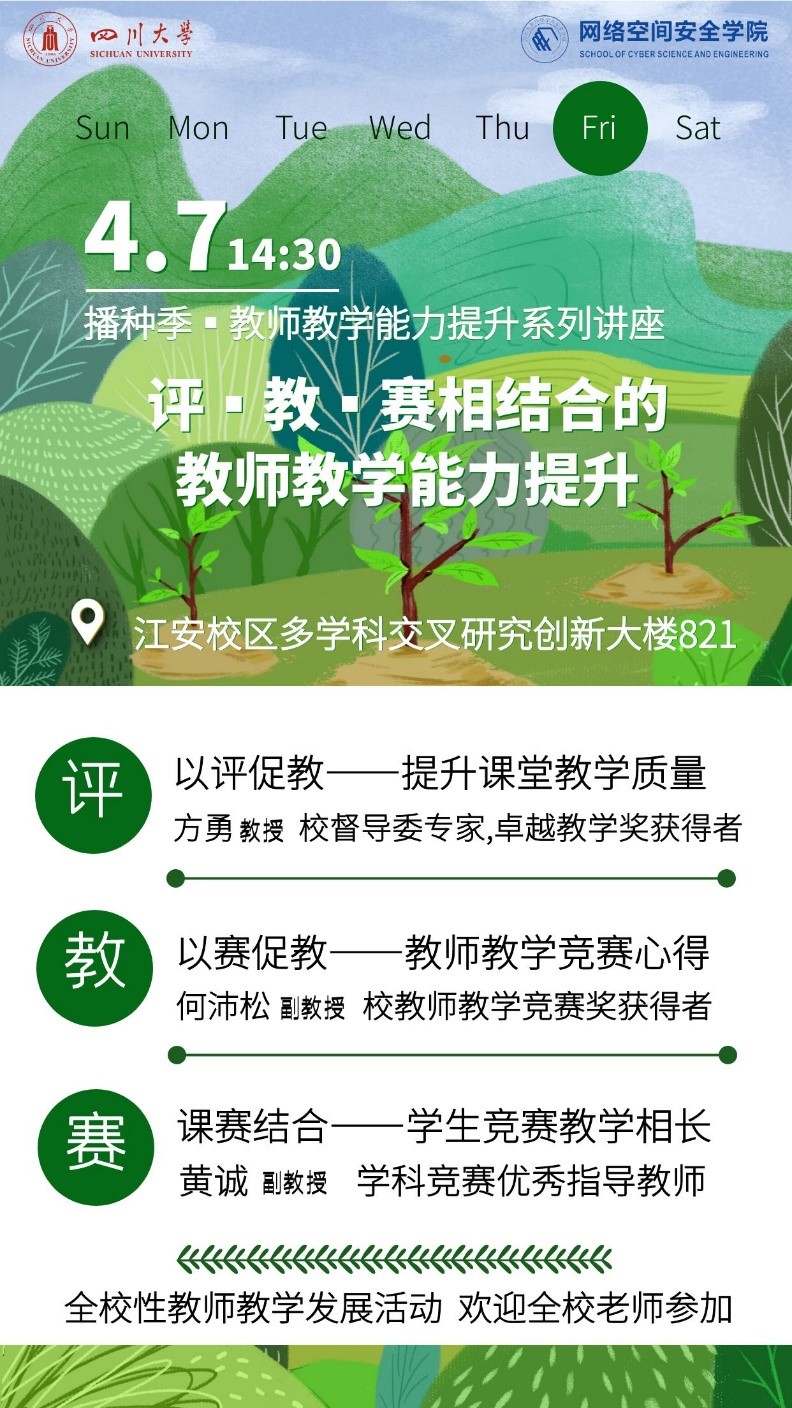 4月7日,公司在江安校区多学科交叉研究创新大楼821会议室顺利开展明陞m88官方网站教师教学发展活动——评▪教▪赛相结合的教师教学能力提升,学院邀请到了校督导委专家、卓越教学奖获得者方勇教授、校教师教学竞赛奖获得者何沛松副教授、学科竞赛优秀指导教师黄诚副教授三位优秀的老师作为主讲嘉宾,与学院的青年教师们共同分享宝贵的教学经验。活动由学院副经理杨频主持,学院的20多位老师到场参加了此次活动。