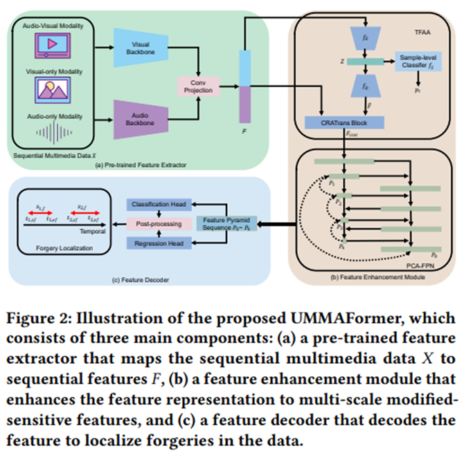 随着人工智能生成技术的不断发展,生成的虚假媒体愈加逼真,使“眼见为实”、“有图有真相”的思维方式受到质疑,因此,多媒体内容的真伪鉴别变得愈加困难。现有的研究通常仅基于二分类器来区分整段多媒体内容的真伪,对于局部伪造内容缺乏有效的检测手段。这篇论文正是针对这一问题提出了一种新颖的通用框架——UMMAFormer。该框架能够适应不同模态多媒体内容,包括音频、视频或者音视频多模态,并从中精准预测伪造片段的开始和结束时间,实现时序局部伪造内容的定位。为了增强对时序异常特征的关注,本文采用了一种创新的时序特征异常注意模块,这使得系统在检测伪造内容时更加准确。此外,针对局部短伪造片段特征的增强,论文还引入了并行交叉注意特征金字塔网络,进一步提升了性能。为了验证所提方法的有效性,还构建了一种专门针对视频涂改场景的时序视频涂改定位数据集。实验结果表明,所提方法在多个基准数据集(如Lav-DF、TVIL、Psynd等)上均取得了最先进的性能。