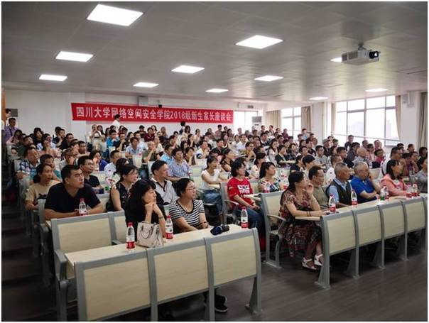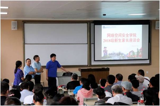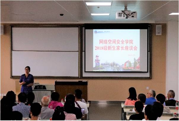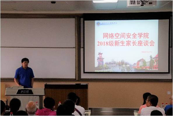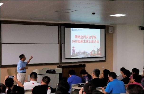 在2018级新生家长热烈的掌声中,副经理杨频教授从生活中的网络安全、企业安全、个人安全等方面阐述了网络空间安全是当今社会发展的基础,并为家长深入浅出的讲解了网络安全卓越人才计划。随后重点介绍了学院开展国际合作联合培养、跨学科人才培养等方面的培养优势和发展情况。最后阐述了网络空间安全专业发展的美好前景和未来就业及发展趋势。