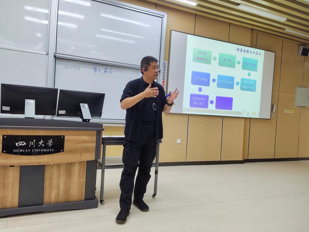 首先,网络空间全学院常务副经理陈兴蜀教授为大家介绍了潘柱廷老师。潘柱廷老师,业界常称“大潘”,教授级高级工程师。现任安天科技集团资深副总裁,北向峰汇创始人。长期从事信息安全技术、产品管理、战略研究和教育工作,并在相关领域取得了杰出的成就。