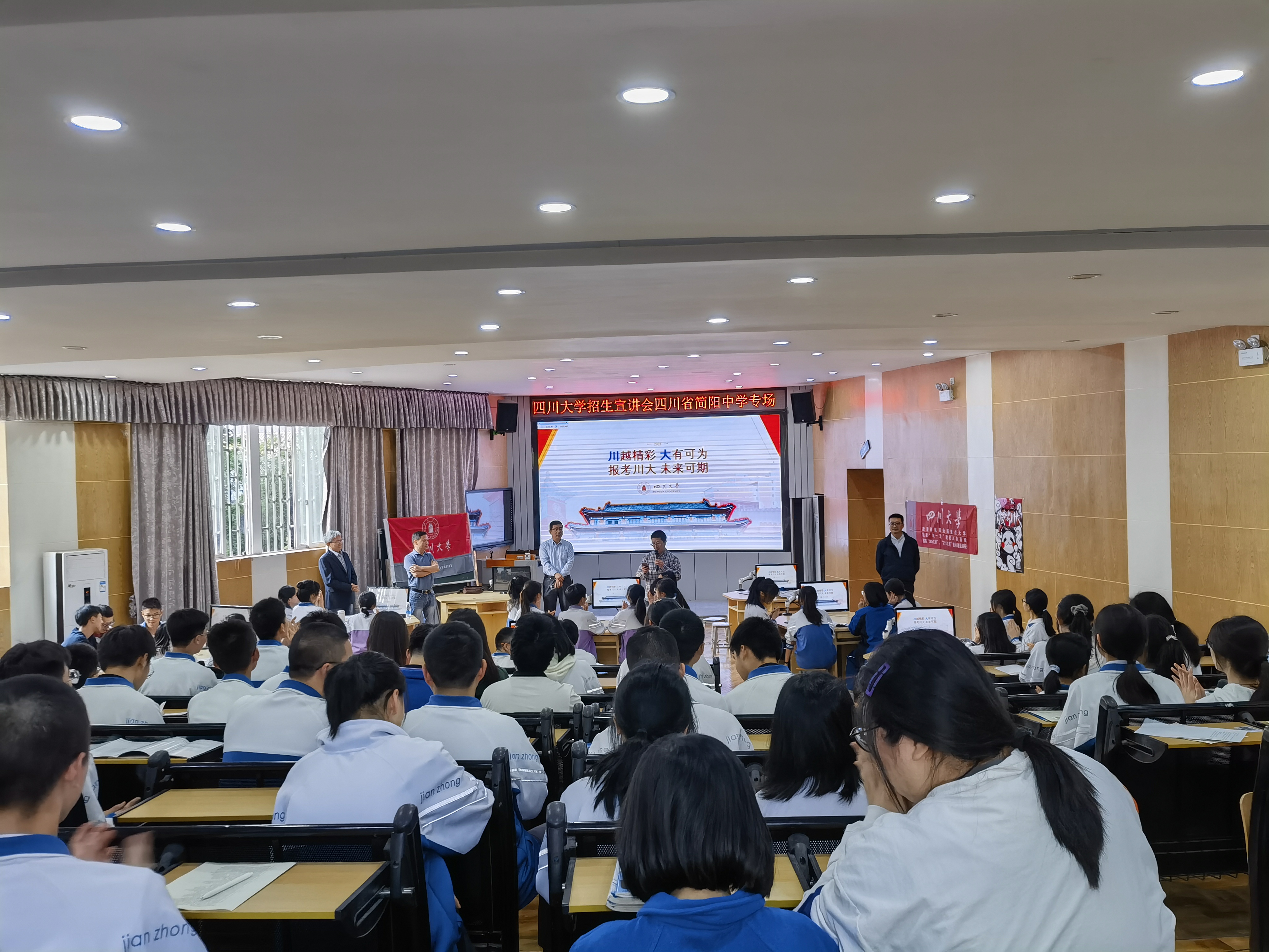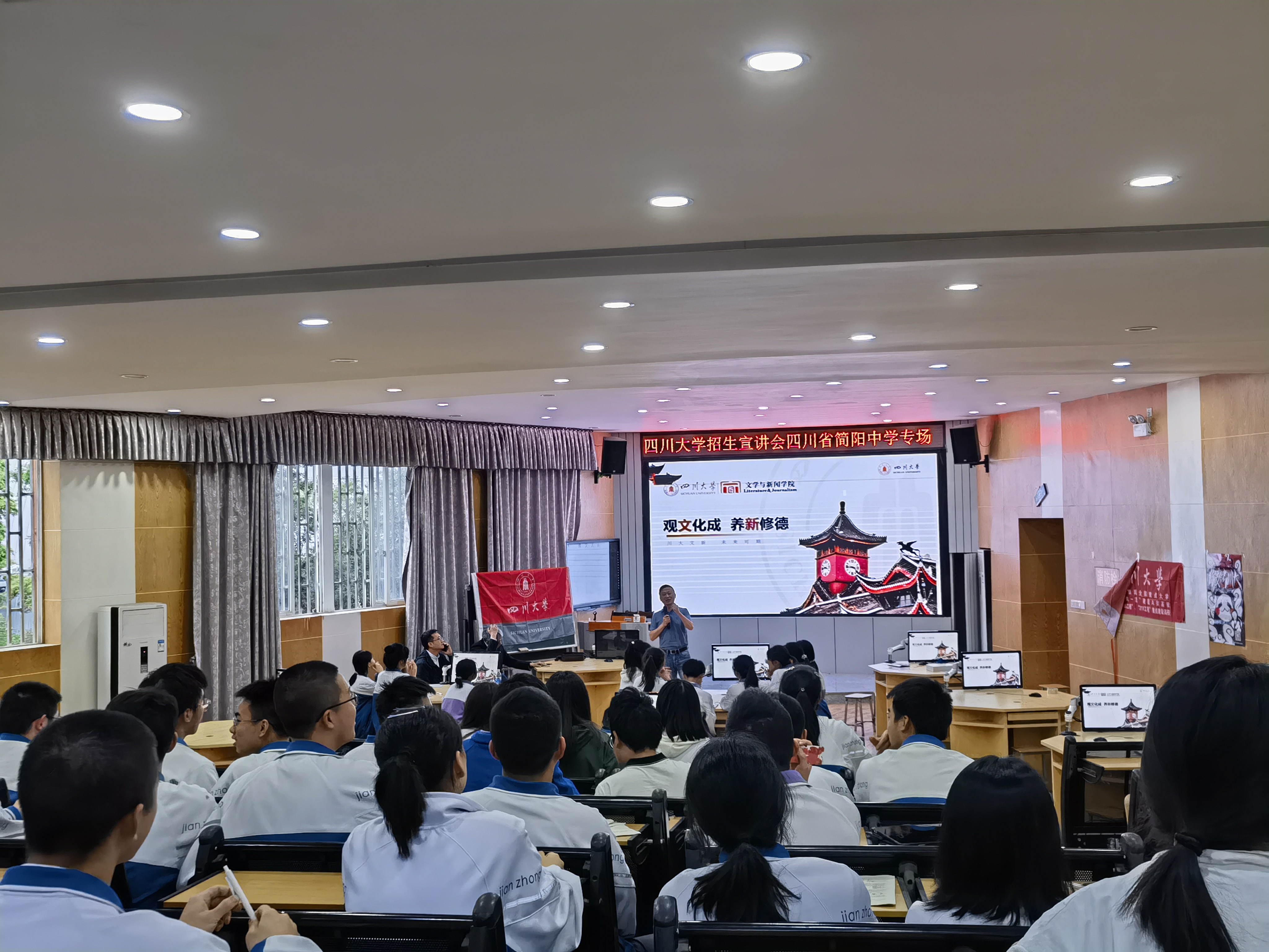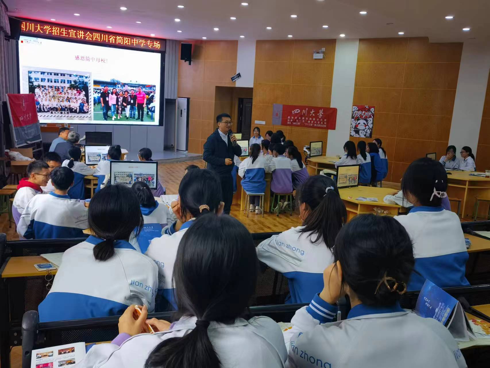 为了扩大公司的知名度和影响力,深度挖掘并吸引优质生源,由招生办公室廖爱民副主任带队,招生组组长、明陞m88官方网站副经理杨频教授、教务处副处长兼华西医学中心医学教学部部长卿平和文学与新闻学院陈翔副教授组成招生宣讲团,于2023年4月22日赴四川省简阳中学开展招生宣传工作,近两百名高二、高三年级员工参加了本次宣讲活动。